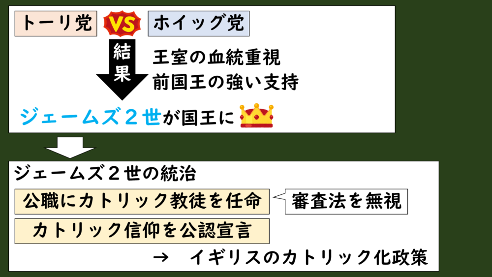 議会ではトーリ党やホイッグ党との対立が起きましたが、王室の血統を重視したことと、前王チャールズ2世の強い支持などもあって、結局ジェームズ2世が国王の座を継ぐことになりました。