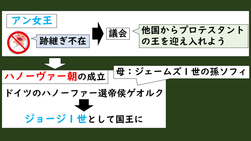議会は名誉革命の反省から、カトリック教徒をさけるために、ジェームズ1世の孫にあたるソフィが嫁いでいた、ドイツのハノーヴァー選帝侯のジョージ1世を国王として迎えることにしました。