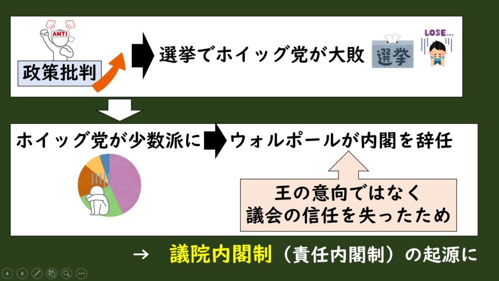 これらによって、ウォルポールの内閣辞職は、イギリス史上初の「議会の多数派が内閣を支える」という議院内閣制(責任内閣制)の原則が実践された瞬間だったんです。