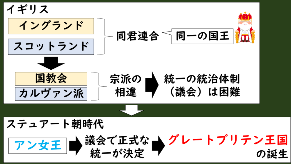 ただし、イングランド王国は国王を頂点とするイギリス国教会、スコットランドはカルヴァン派の信徒が多く、宗教のスタイルに違いがあったので、国家として完全に1つにするには難しい状況だったんです。