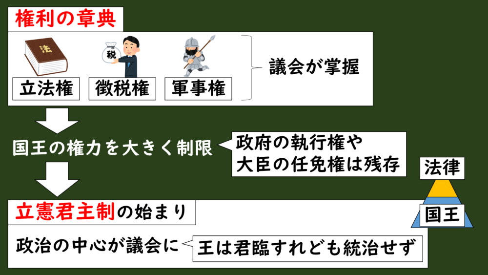 このように立法権や徴税権、軍事権を議会が持つことを明文化したことで、王の権力は大きく制限されることになりました。