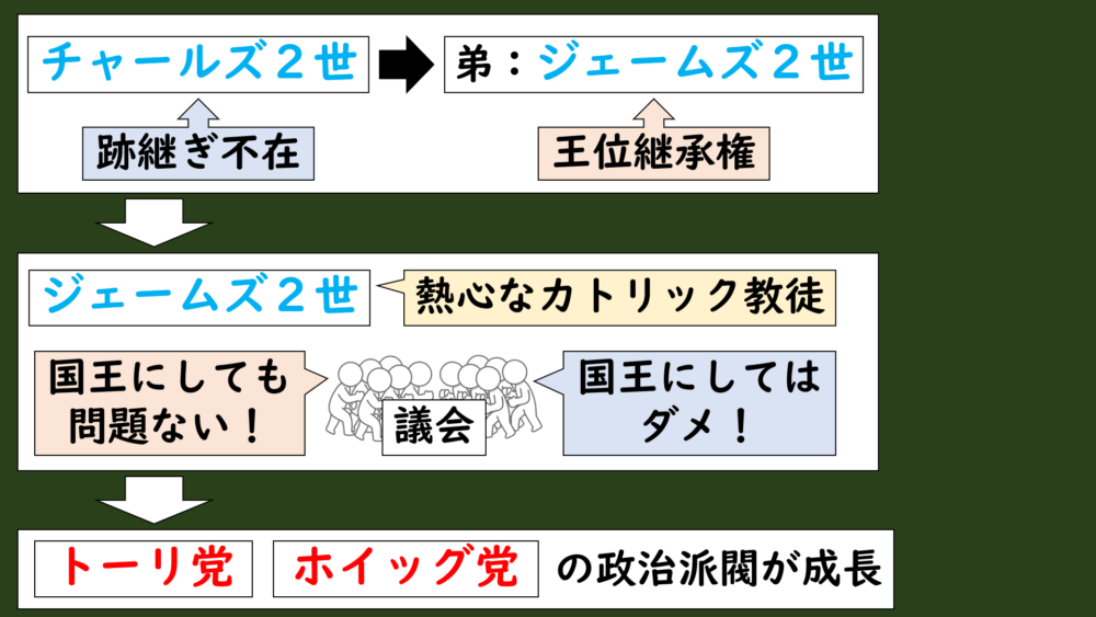 なので、議会では「カトリック教徒である者を国王にしていいのか。」という問題について意見が割れて、対立が起こるようになります。