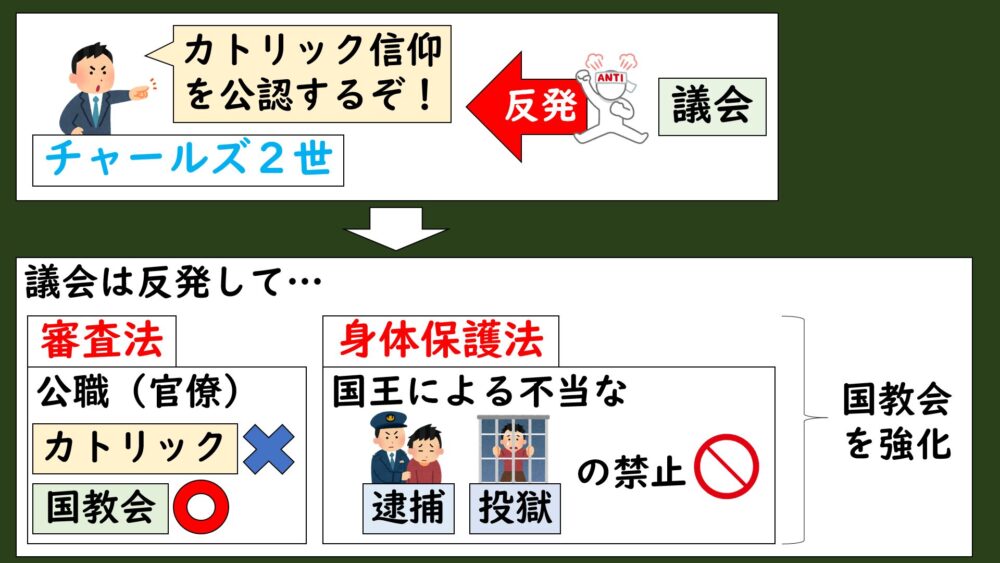 これらの法律によって、議会は国教会の立場を強化しようとして、反発を受けたチャールズ2世はカトリック化を断念することになりました。