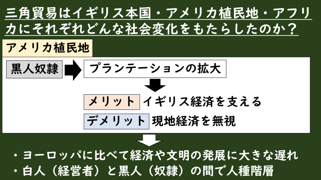 SQ:三角貿易はイギリス本国・アメリカ植民地・アフリカにそれぞれどんな社会変化をもたらしたのか?