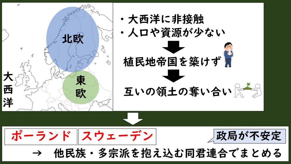 その結果、ポーランドやスウェーデンなどでは、民族や宗派の異なる地域を同君連合でまとめるという、きわめて不安定な国家システムを抱えることになりました。
