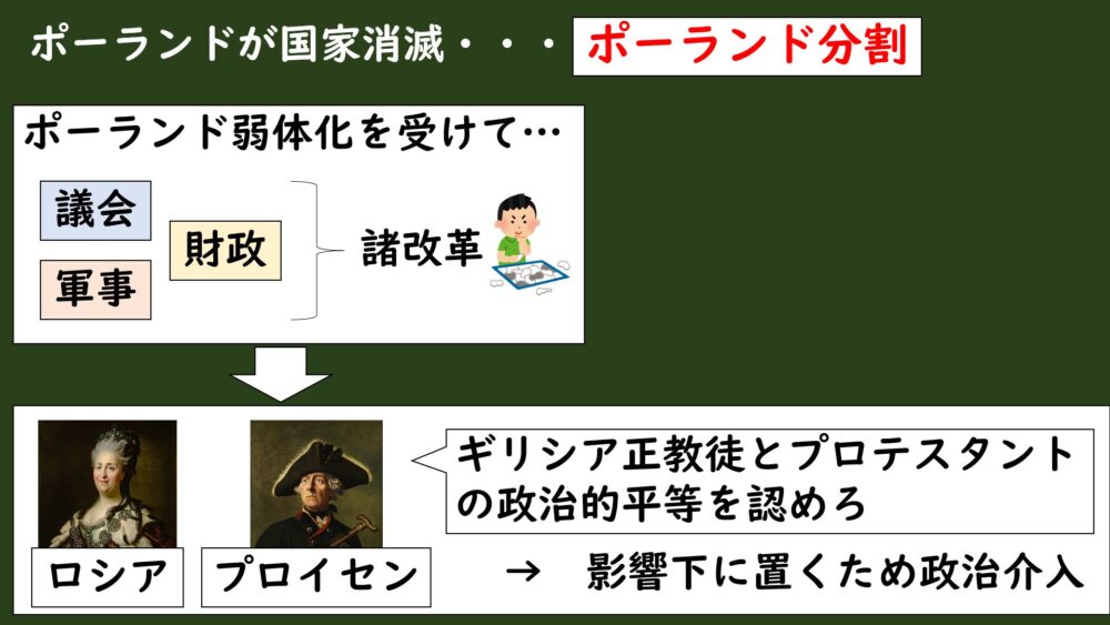 国家の立て直しを図ろうとしたんですが、これに目をつけたのがロシアのエカチェリーナ2世とプロイセンのフリードリヒ2世でした。