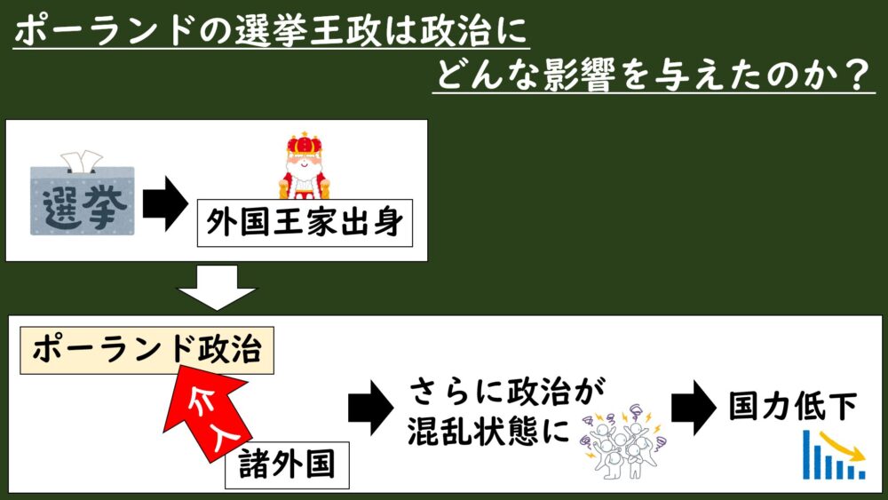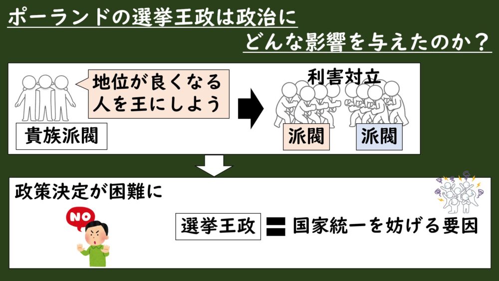 こうした制度のもとで、ポーランドでは貴族同士の政治闘争や周辺諸国の干渉などの混乱が起きてしまい、次第に国力を失っていくことになります。