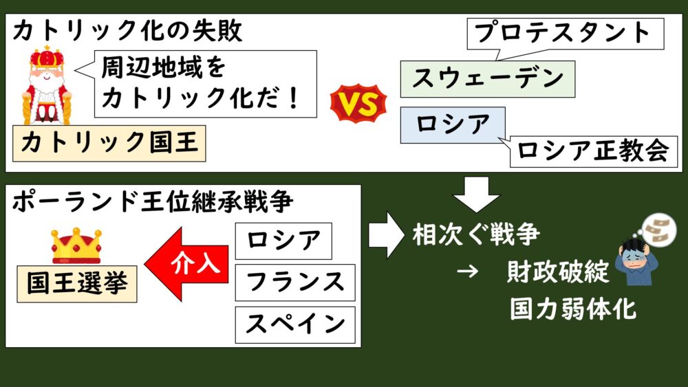 プロテスタントのスウェーデンや、ロシア正教会のロシアなどがカトリック化に反発して、ポーランドに侵攻してきたんです。