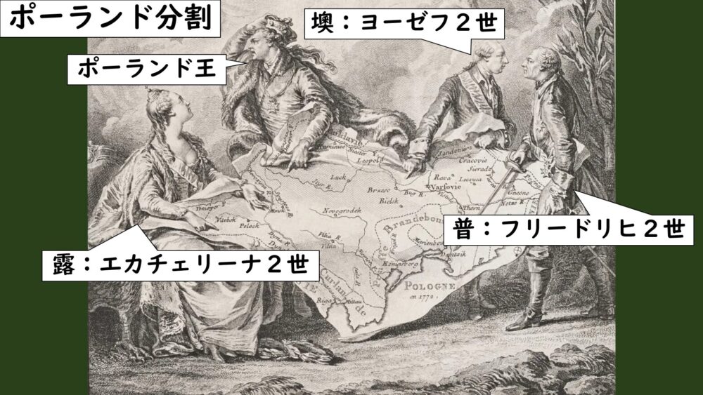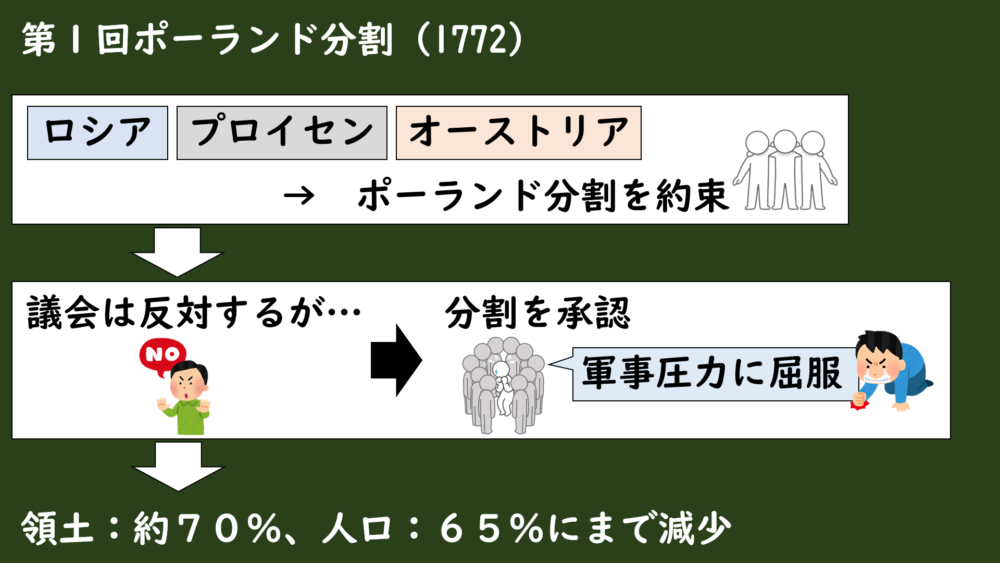 ポーランド議会は当然これに反対の声を上げつつも、各国の軍隊がポーランド国内に進駐してきて圧力をかけてきたので、各国の圧力に屈服する形で領土の分割を承認してしまったんです。