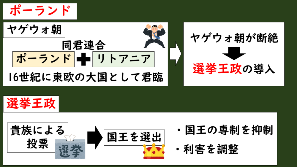 加えて、選挙王政ではポーランド人に限らず、外国の王家(例:フランスのヴァロワ家やスウェーデン王家)からも選ばれていました。