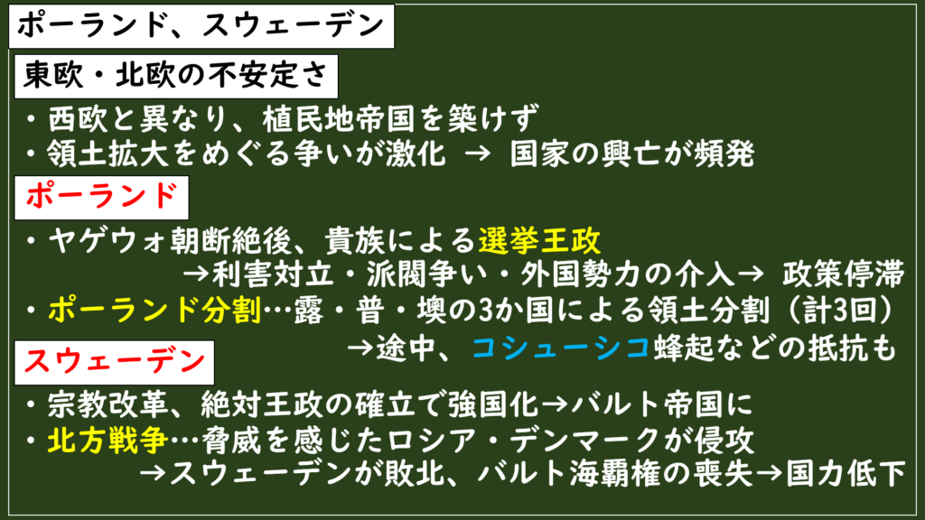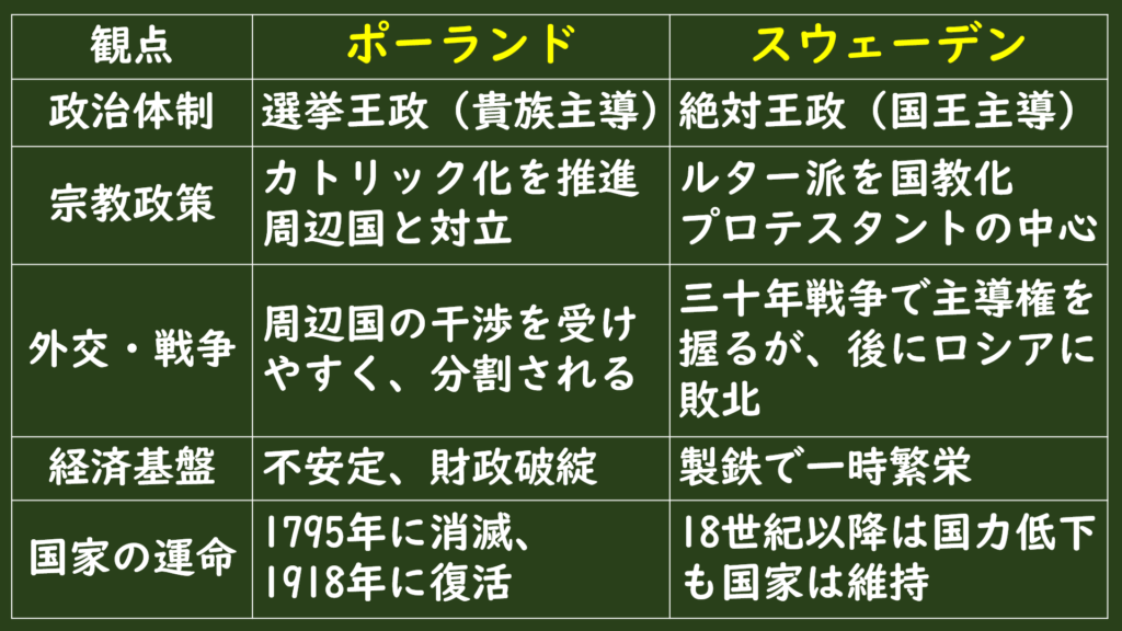 A:ポーランドは選挙王政により貴族間の対立と外国勢力の干渉を招き、国家統合と政策決定が困難となった結果、諸外国に分割されて消滅した。一方、スウェーデンは絶対王政と鉄資源による経済基盤を背景に一時的な強国化を果たし、国際的地位は低下したものの、国家としての統一を維持し存続することができた。