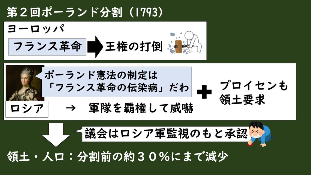 ちなみに第1回分割に参加していたオーストリアは、この時フランス革命軍に敗れて分割に参加する余裕がなかったので、ロシアとプロイセンの2国で分割協定が結ばれることになりました。