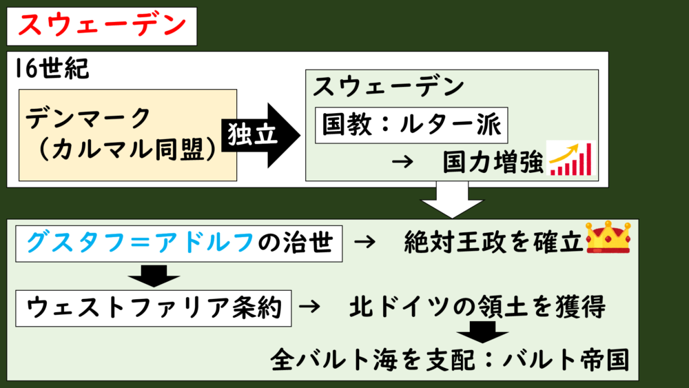 17世紀前半には国王であり英雄のグスタフ=アドルフが登場して、絶対王政を確立させます。