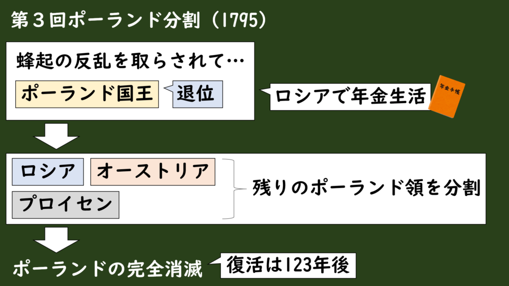 そしてロシア・プロイセン・オーストリアの三国が、残されたポーランド領を完全に分割することになり、ポーランドは国家として完全に消滅することになりました。