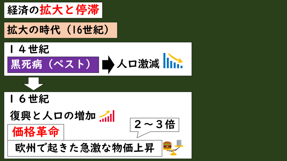 そしてこの時期、近世ヨーロッパは経済成長をし続けていたわけではなく、経済の拡大と停滞を繰り返しながら発展していきました。