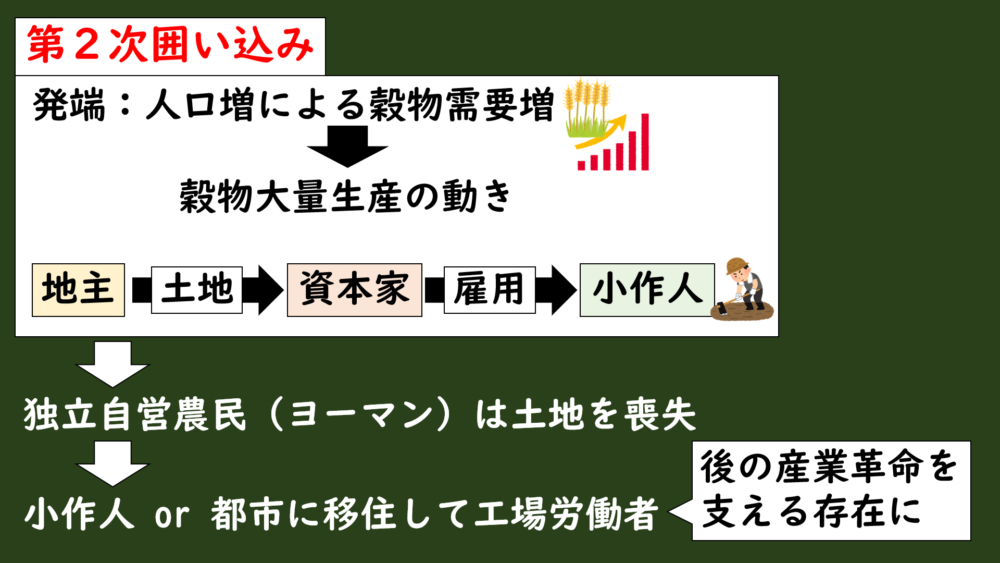 第1次では、羊の毛をとるために牧場を作ろうとして農地を囲い込んだ動きでしたが、第2次では、穀物をたくさん育ててもうけるために農地を囲い込んだものでした。