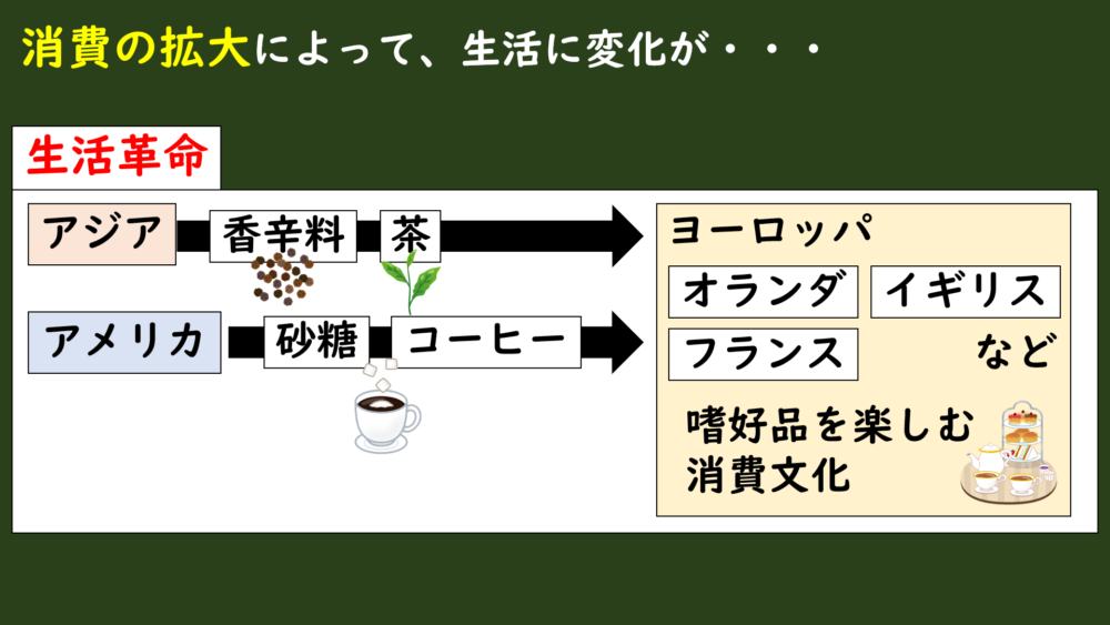 香辛料や砂糖、茶やコーヒー、綿製品などが入ってきたことで、王族や貴族、都市のブルジョワ(市民)などは嗜好品を楽しむようになり、生活が大きく変わっていきました。