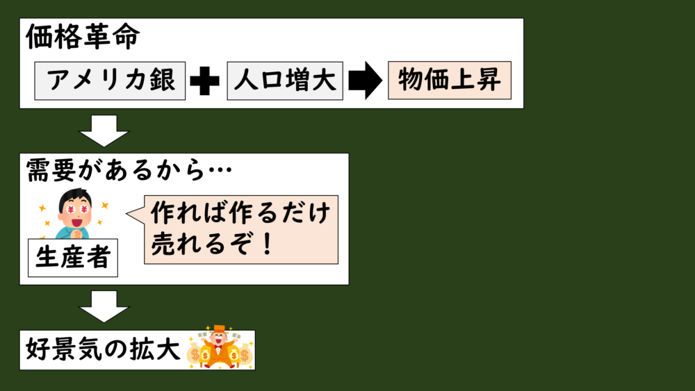 こうした価格革命によって、ヨーロッパでは物価上昇が起きたんですが、物価の高騰は何も悪いことだけではありませんでした。