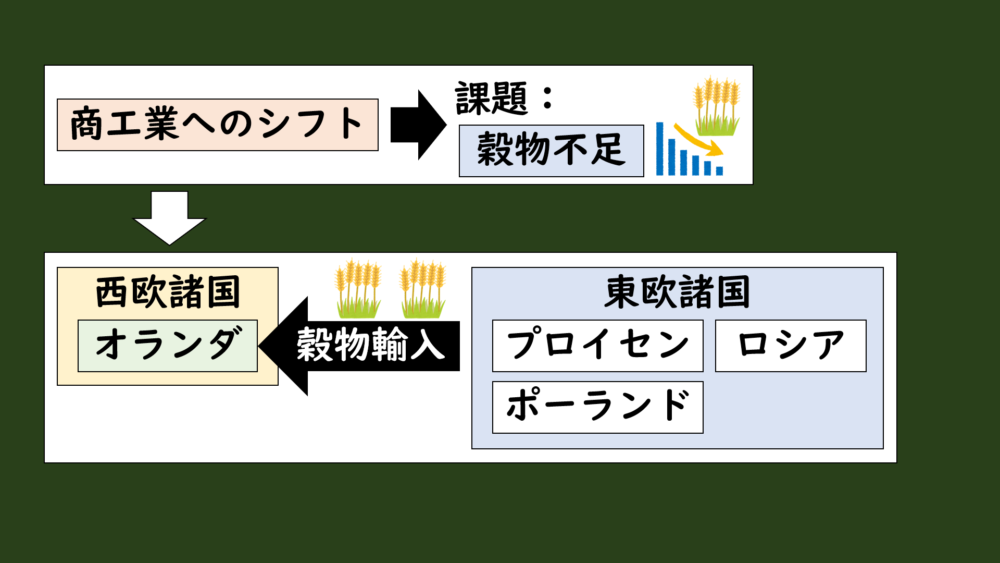 商業革命によって繁栄したオランダなどの西欧諸国は、穀物不足が起きて周辺諸国から穀物を輸入する必要に迫られました。