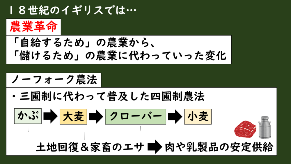 そして、イギリスでは、18世紀に農業革命というものが起きました。
