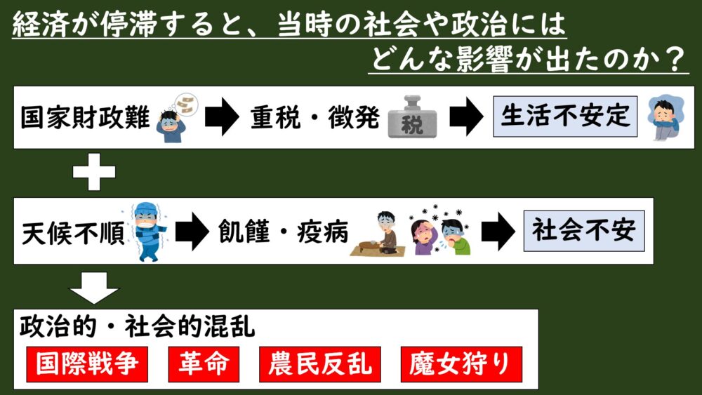 国家財政が悪化し、重税や徴発が強まったことで人々の生活が不安定になり、飢饉や人口減少と結びついて社会不安が拡大した。その結果、各地で戦争や反乱、魔女狩りといった政治的・社会的混乱が引き起こされた。
