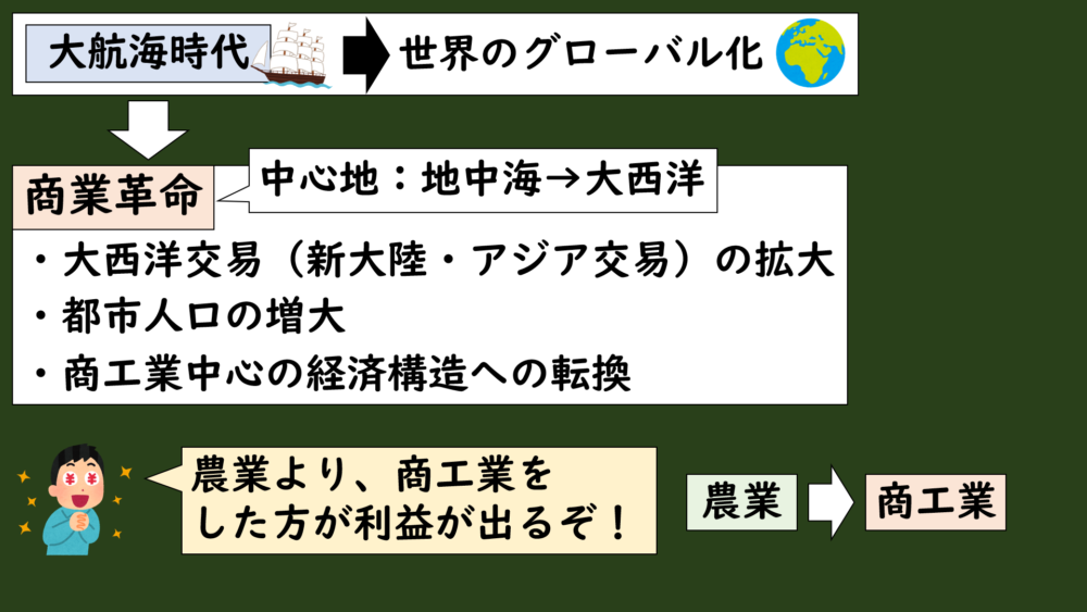 という状況が生まれて、それまでの農業から商工業にシフトしていく流れができました。