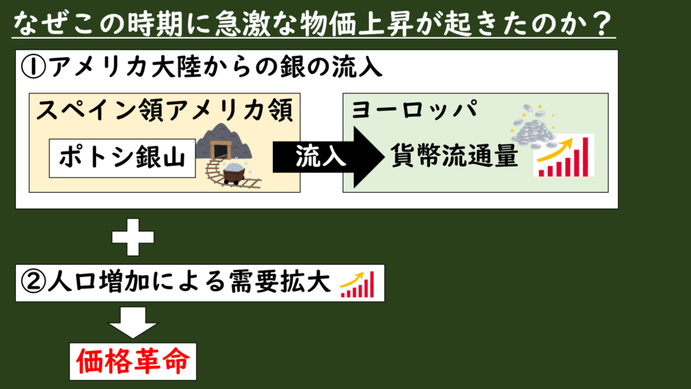 これらの理由から、100年以上続く物価上昇である価格革命が起きたというわけなんです。