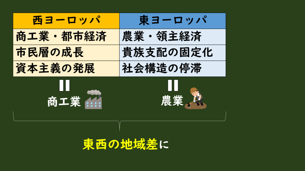 このようにして、「西欧=商工業、東欧=農業」という東西の地域差が現れることになったんです。