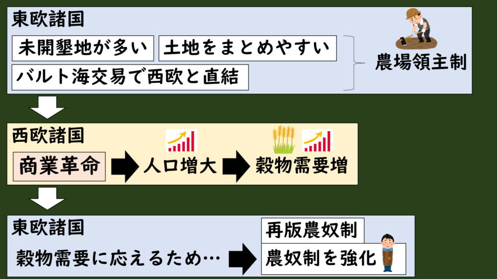 東欧諸国では、農業生産は農奴に依存していたので、西欧の穀物需要に応えるために、農奴を土地に縛り付ける農奴制のさらなる強化をおこなうことになりました。