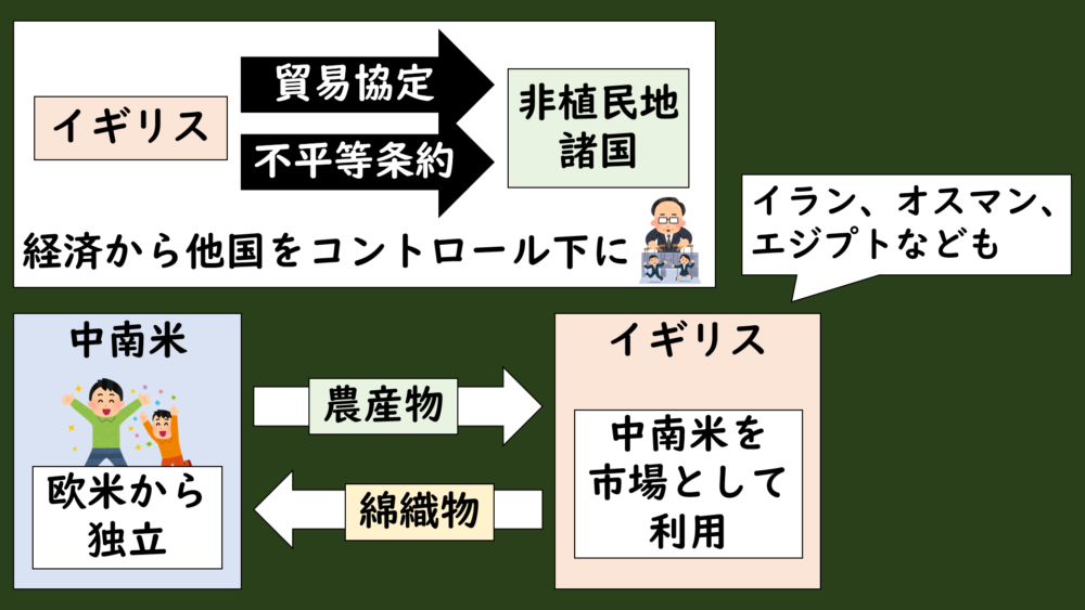 しかし、さらに規模を拡大したイギリスは、独立国(中南米諸国やオスマン帝国、中国など)などの直接支配が難しかった国々に対して、経済的な手段を使って影響力を及ぼそうとしたんです。