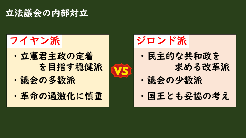 それに対してジロンド派は、国王と妥協を図りながらも共和政を実現させようとしていたので、フイヤン派と対立することになりました。