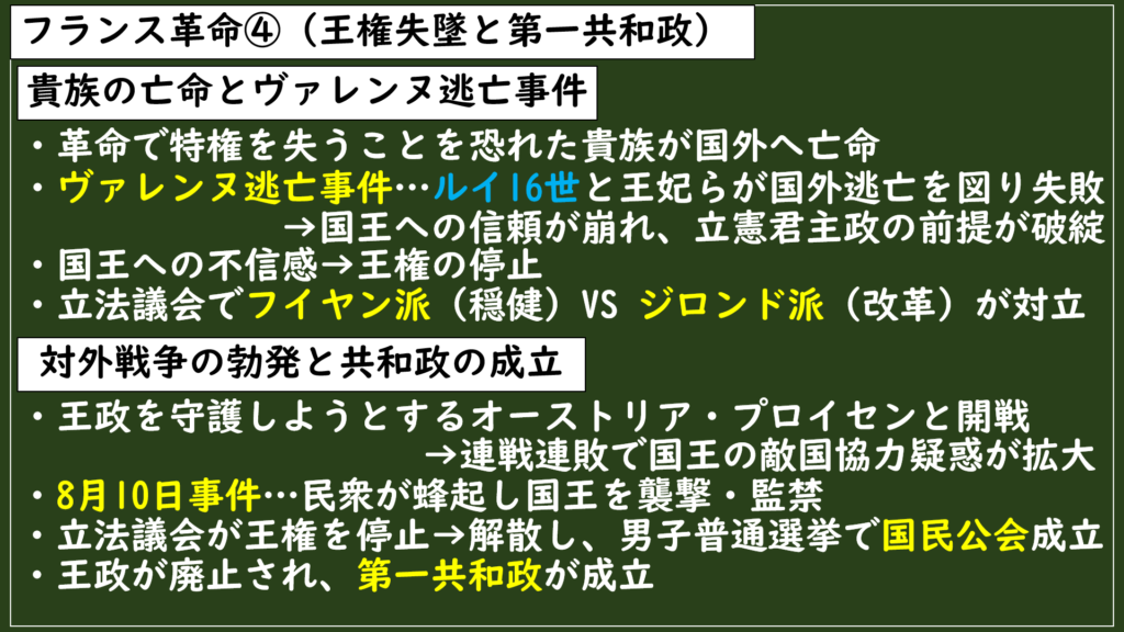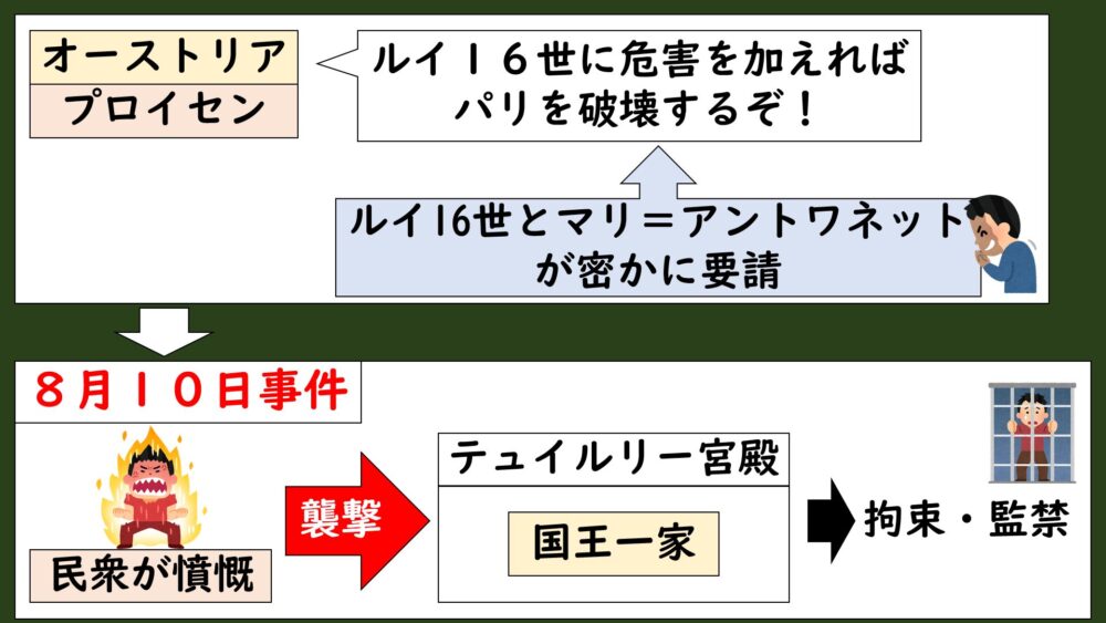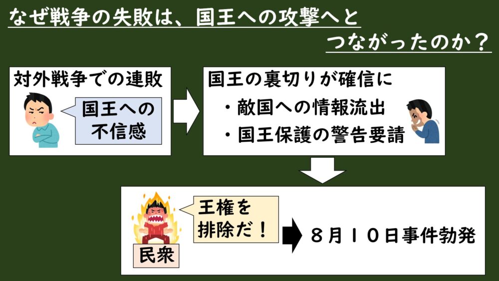 この流れは、[戦争の失敗]→[国王不信の拡大]→[革命防衛のための武装蜂起]という関係で整理できますね。