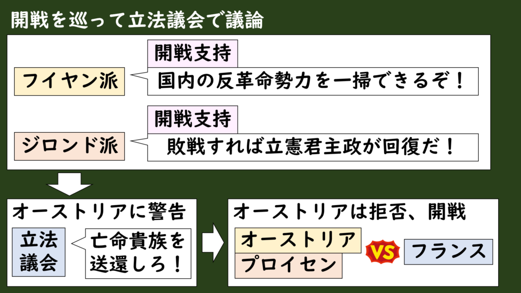 しかし、オーストリアはこれに応じなかったことから、立法議会は満場一致でオーストリアへの宣戦布告を決議することになり、対オーストリア戦争が始まることになりました。