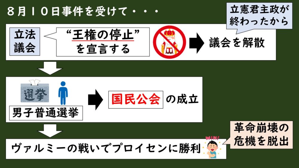 これにサンキュロットが「国王こそが祖国の危機を招いている存在だ」と認識した結果、革命を守るためには王権を排除するしかないと考え、「8月10日事件」が起きたというわけなんです。