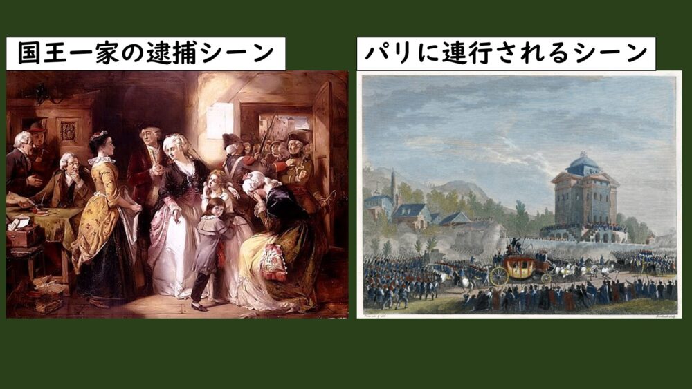 国王一家は大型の馬車で東の国境までいき、護衛と合流するはずでしたが、村人に国王であることがバレてしまい、国王一家はそのままヴァレンヌという町で拘束されてしまいました。