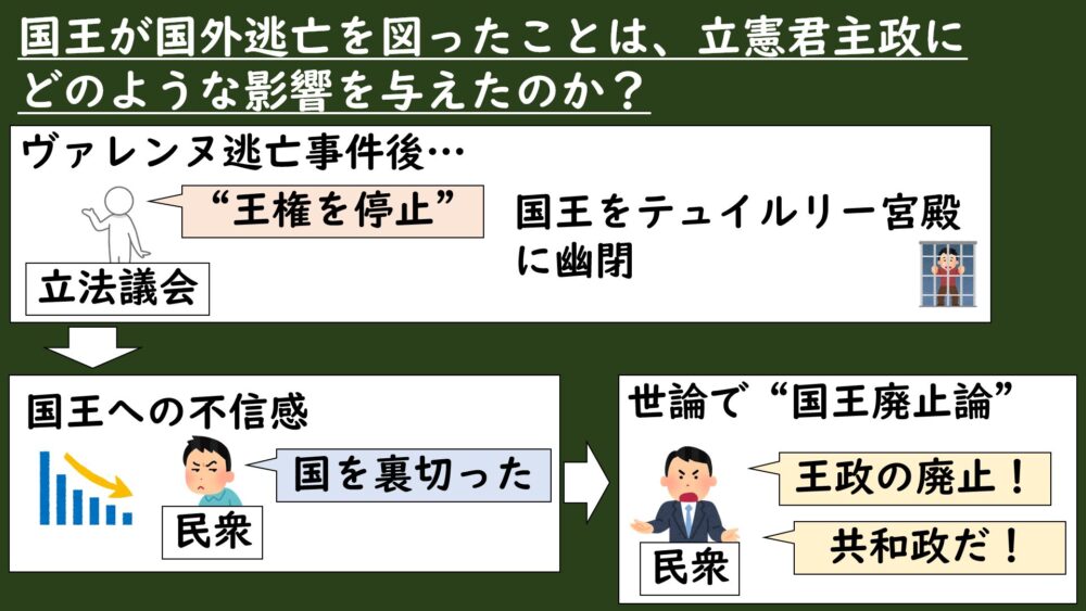 立憲君主政の前提であった国王への信頼が崩れ、王政そのものへの不信が高まり、立憲君主政は成り立たなくなっていった。