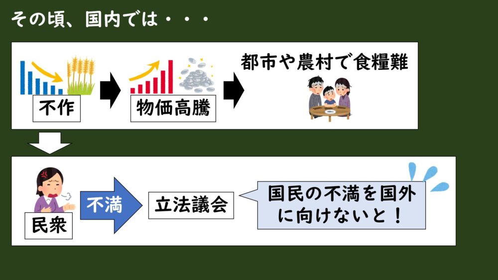 この食糧難によって、民衆の不満の矛先が立法議会に向くようになり、立法議会は民衆の不満の矛先を国内から国外へ向ける必要に迫られるようにもなっていったんです。