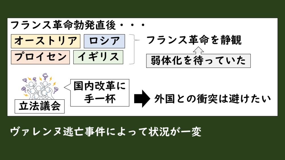 このように、フランス革命はもはや国内の問題だけではなく、周辺諸国も巻き込んだ国際問題に発展していたんです。