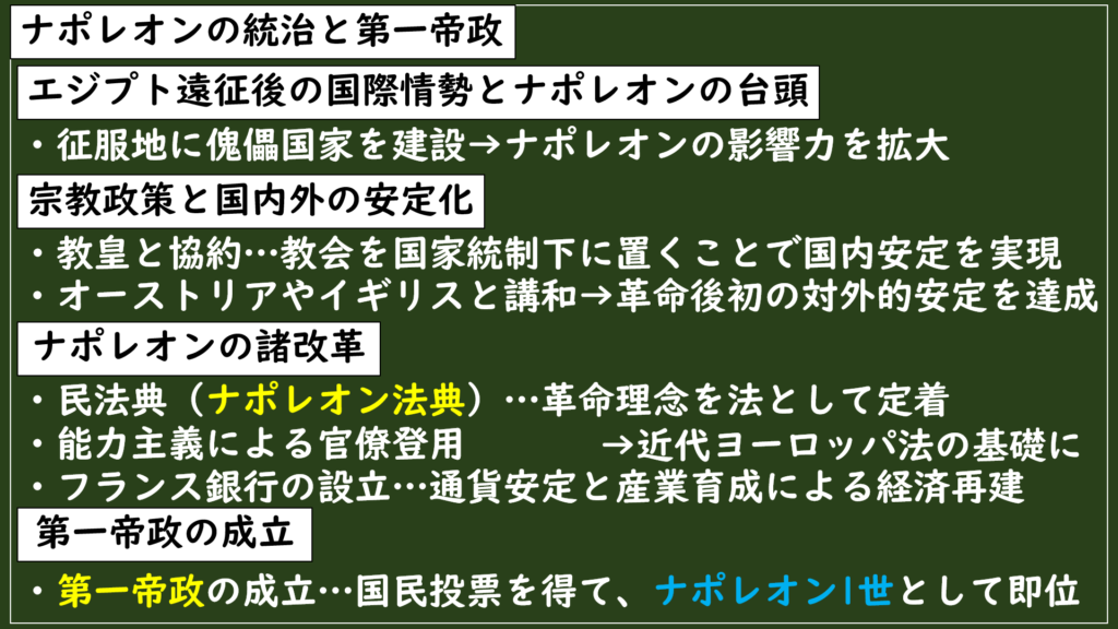 さらに権力を集中させたナポレオンは、フランス革命の成果を社会に定着させるための改革をおこないました。