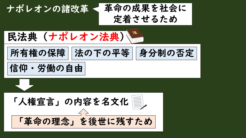 特に、「人権宣言」で示した革命の考え方を、日常生活のルールとして使われる民法に組み込んだことは、革命の成果を一時的なものじゃなく、長く残すことができる大きな一歩だったんです。
