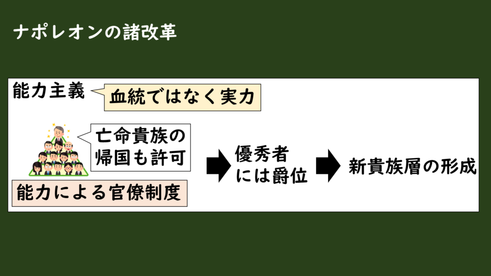 ナポレオンは、革命によって亡命していた貴族たちの帰国を許して、前歴に関係なく能力によって官僚を採用する制度を整えました。