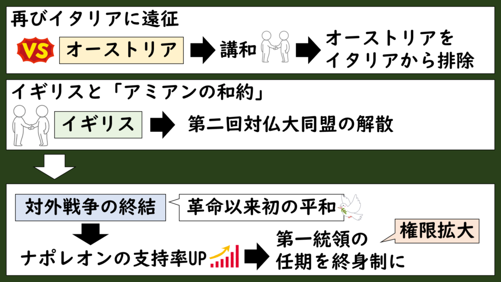 その後、イギリスとの間でもアミアンの和約を結んで、第2回対仏大同盟が解散することになり、長く続いた対外戦争を一時的に終結させることに成功しました。
