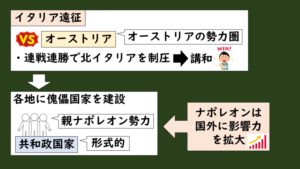 一方で、ナポレオンはそれ以前のイタリア遠征の勝利によって、北イタリア一帯を制圧して、各地に共和政を名目とする傀儡国家(かいらいこっか)を築きました。