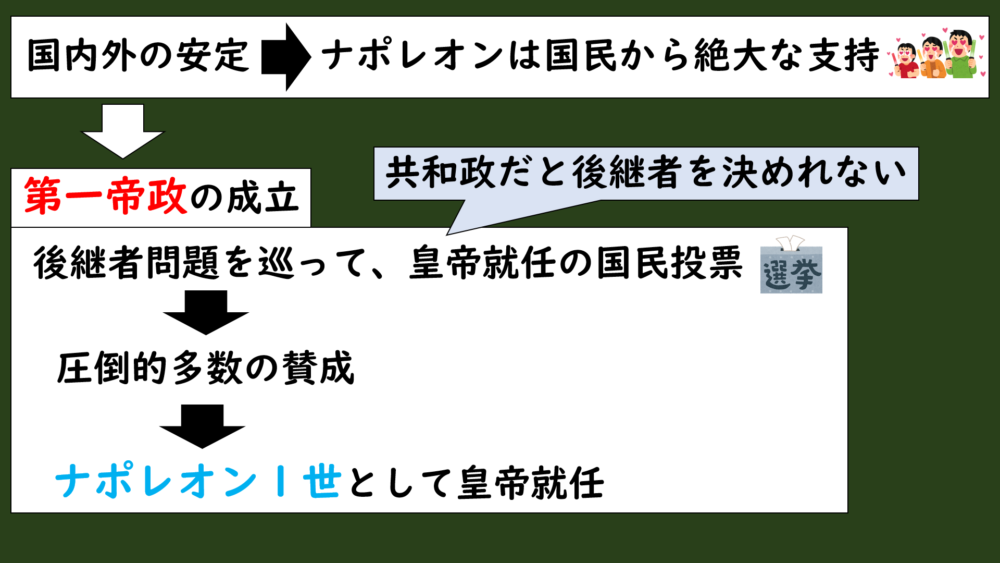 共和政だと、自分で後継者を決めることができないので、自分で後継者を決められる世襲制にするために、自らが皇帝になるための国民投票をおこないました。