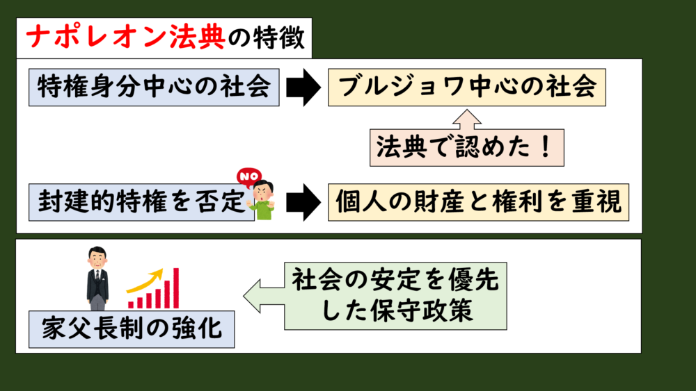 そして、ナポレオン法典の一番の特徴は、封建的特権を持っていた特権身分中心の時代から、市民階級(ブルジョア)が社会の中心になったことを、法律ではっきりと認めたことでした。
