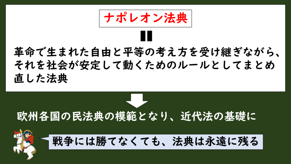 そしてその後、ナポレオン法典はヨーロッパ各国の民法典の模範になっていき、結果としてフランス革命の理念は、近代ヨーロッパの法の基礎として定着していくことになったんです。