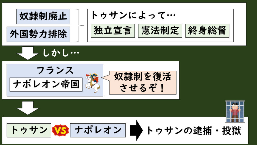 しかし、フランス本国ではナポレオンが権力を握り、植民地支配と奴隷制を復活させる方針を打ち出します。