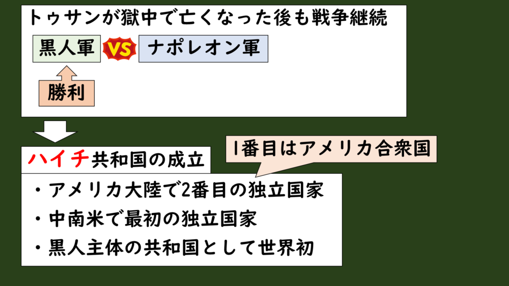しかし、トゥサンが亡くなった後も、後継者たちがフランスに反発したことで独立戦争は継続されることになります。