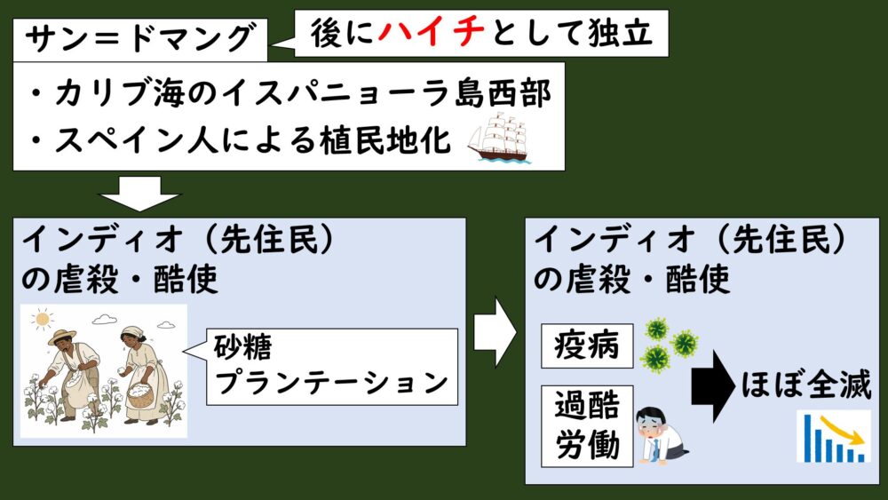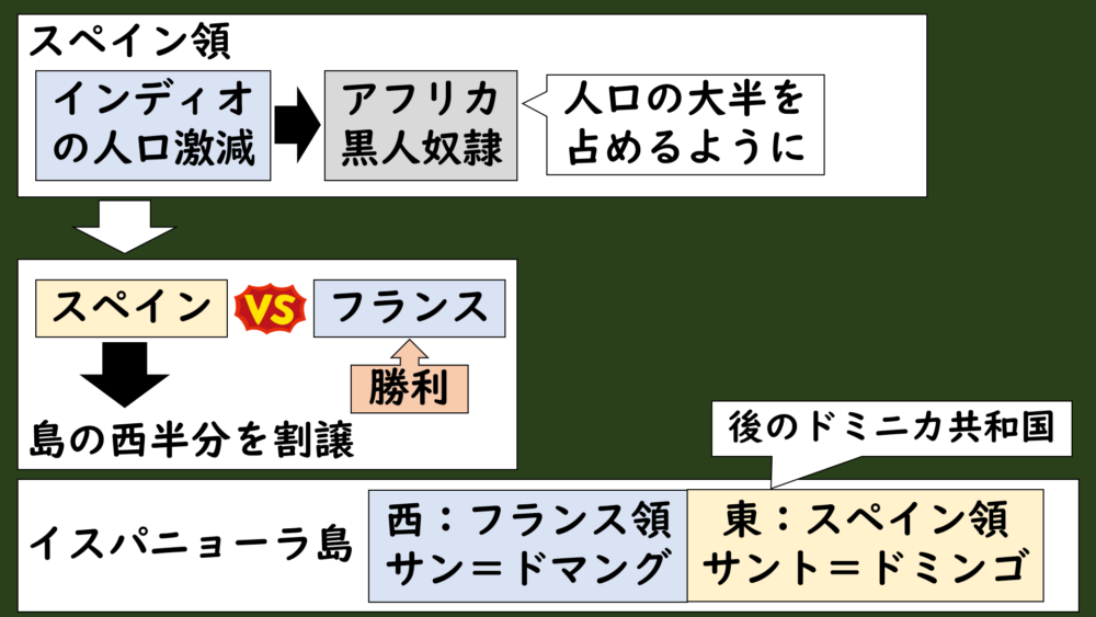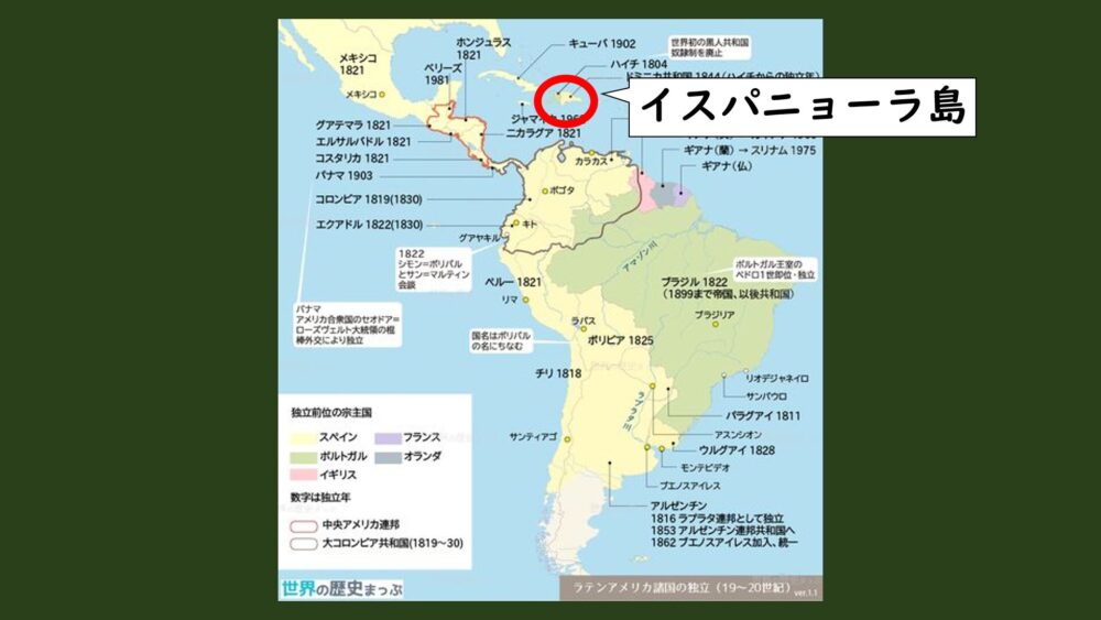 このサン=ドマングが後に「ハイチ」と呼ばれる所です。イスパニョーラ島の西側約3分の1を占めていました。