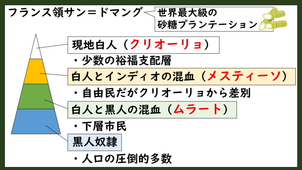この矛盾が黒人奴隷の怒りを爆発させて、やがてハイチ革命へとつながっていくことになります。